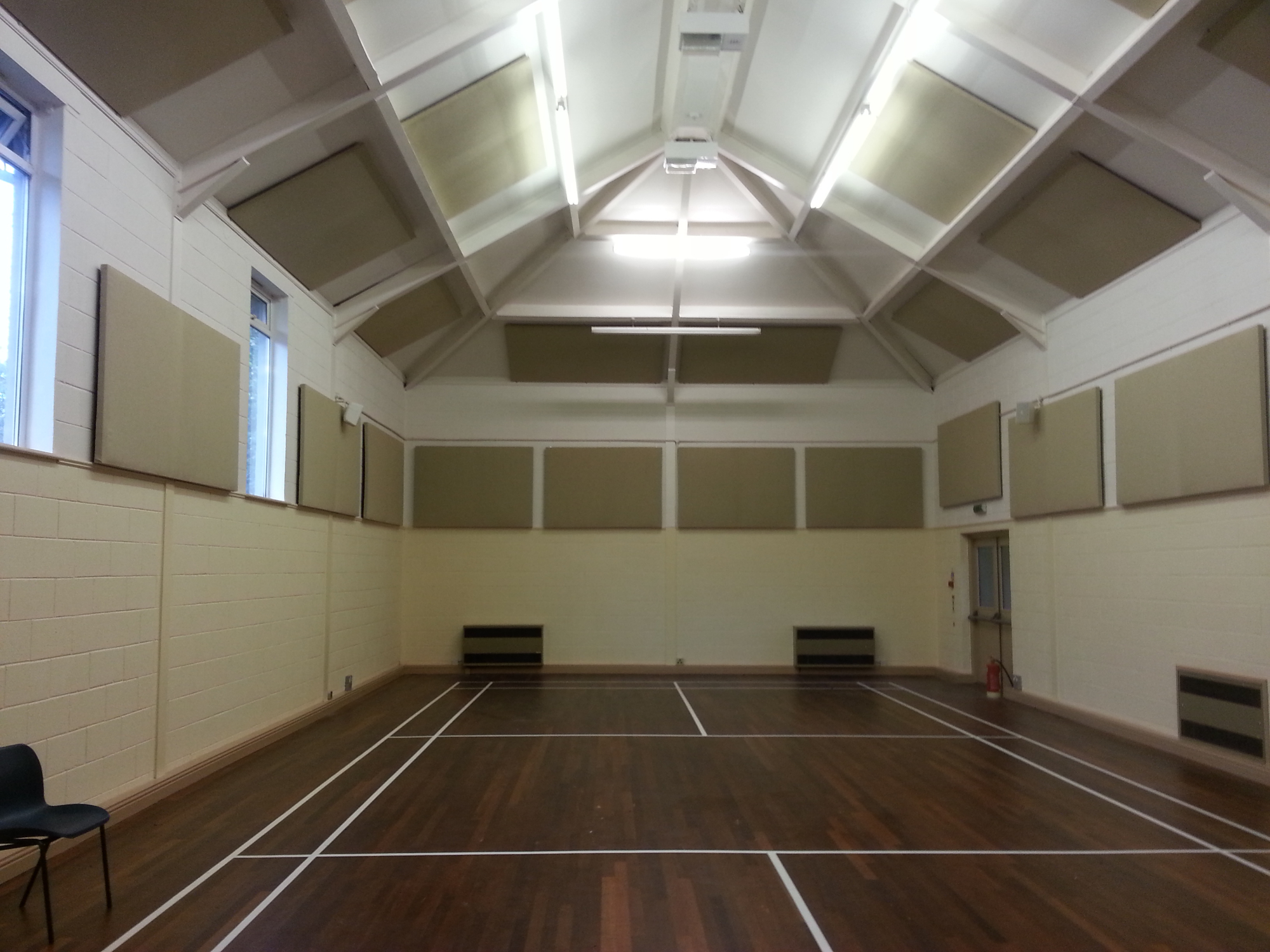 Rob came out quickly and assessed the problem (a very noisy main hall with an echo of over 4 seconds!) Rob proposed a series of acoustic panels on the ceiling and upper parts of 3 walls and the difference is astonishing!